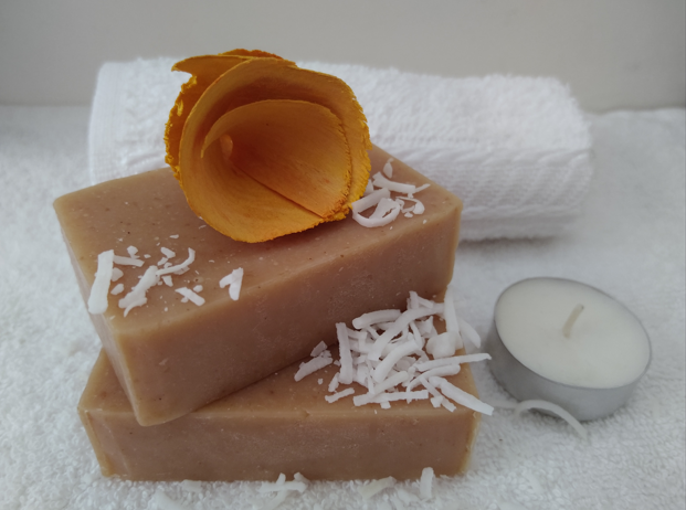 Jabón con leche de coco que nutre y suaviza todo tipo de piel, adicionado con cáscara de nuez que sirve como exfoliante suave.